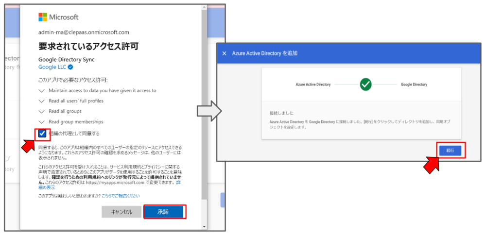 正しいコードを入力し、【検証】をクリックすると、下記の「要求されているアクセス許可」の画面が現れ、「組織の代理として同意する」にチェックを入れてから【承諾】をクリックする。設定に問題がなければ、「Azure Active Directory」と「Google Directory」との間に接続成功のマークが表示されるので、【続行】をクリックしたら接続が完了になります。