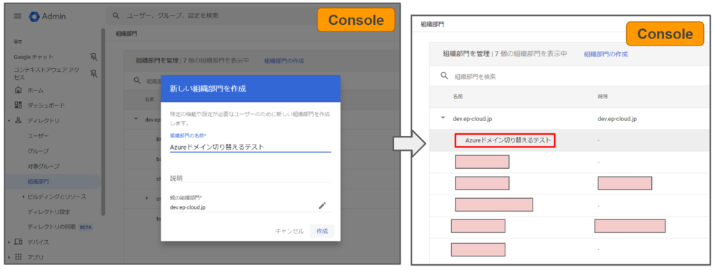 事前にGWSコンソールで、【組織部門の作成】をクリックし、目標ドメイン元で新しい組織部門を作成をクリックし、「組織部門の名前】に “Azureドメイン切り替えテスト” を記入してから【作成】ボタンをクリックします。