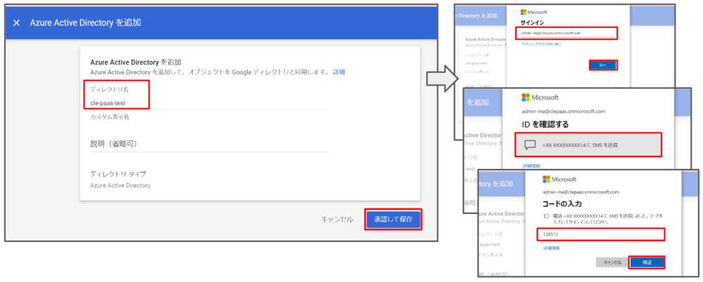 そして、追加したいAzure Active Directoryでディレクトリ名を記入し、【承認して保存】に進み、お持ちのMicrosoftアカウントでMicrosoft Azureにログインします(2段階認証は必要かもしれない)。