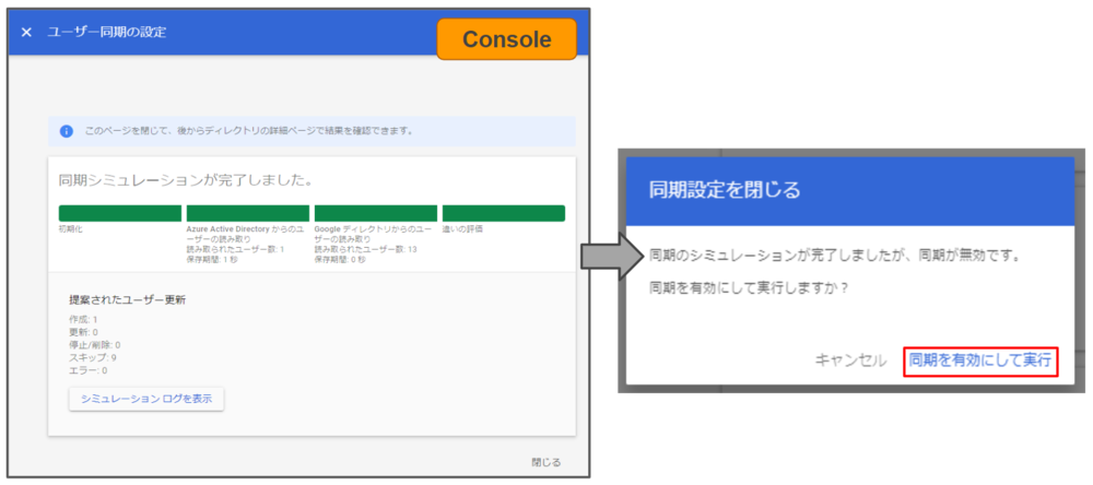 同期シミュレーションが成功の場合は、本番の同期の実行に移り、【同期を有効にして実行】ボタンをクリックして進んでください。
