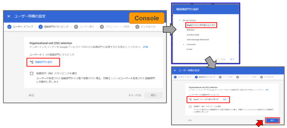 組織部門にて事前に作成された「Azureドメイン切り替えテスト」が存在することを確認した後、「組織部門のマッピング」をクリックし、同期対象である「Azureドメイン切り替えテスト」を選び、【続行】ボタンをクリックして次のステップに進みます。
