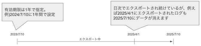この設定は初回ログ出力時からの有効期限になるので、有効期限の前日などに出力されたログも有効期限の日に一緒に消えてしまいます。
