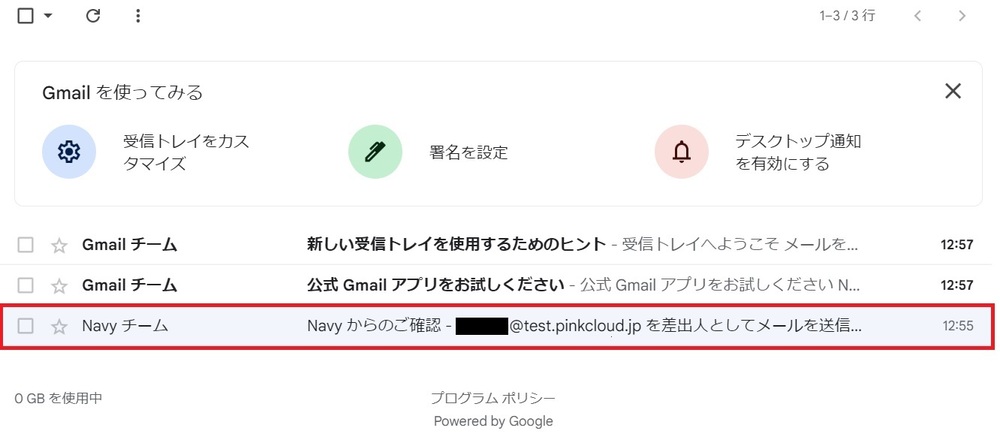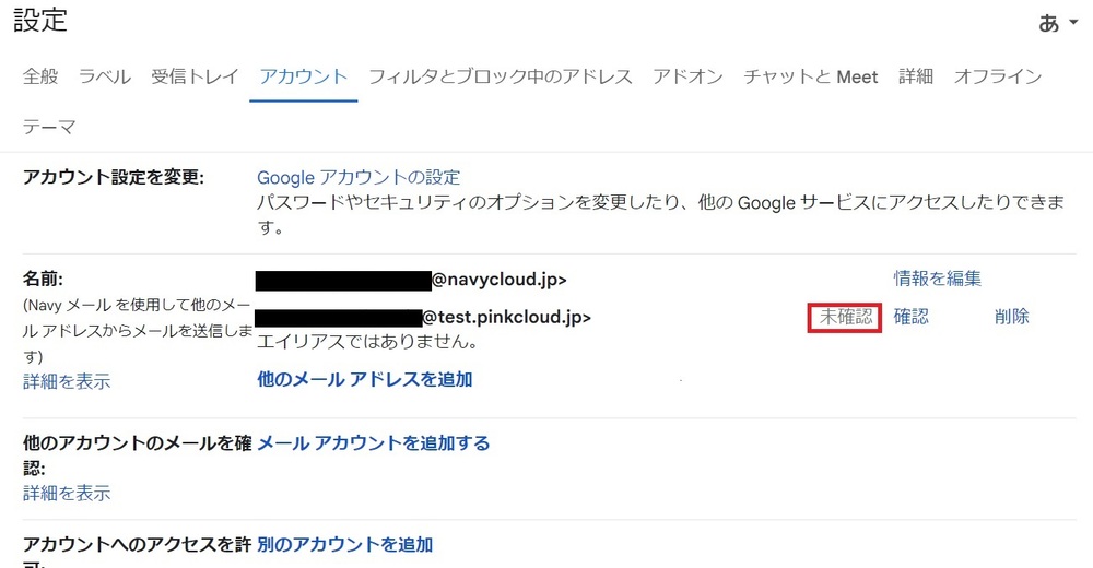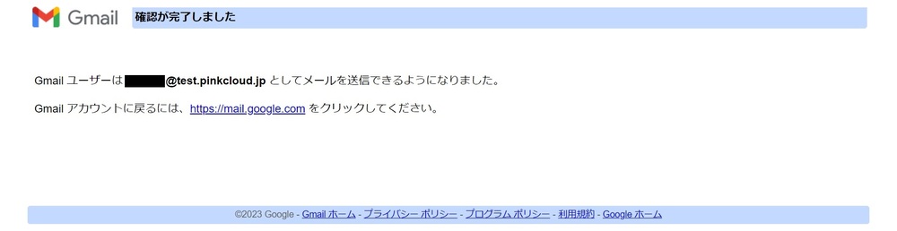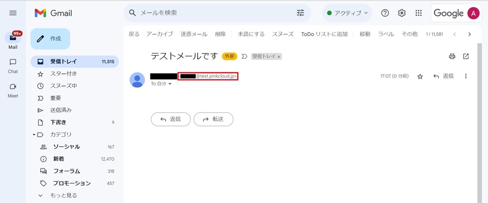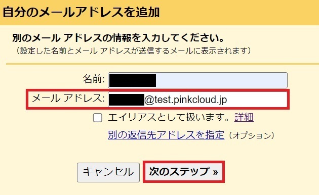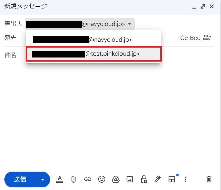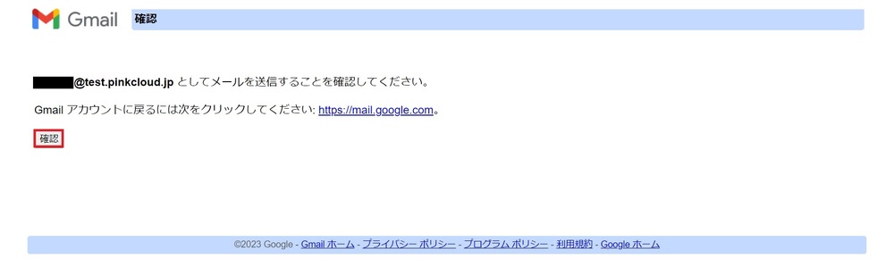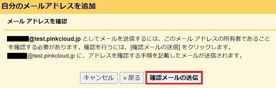 送信元を変更してメールを送信するためには、そのメールアドレス(ここでいうユーザー名@test.pinkcloud.jp)の所有者であることを確認することが必要です。