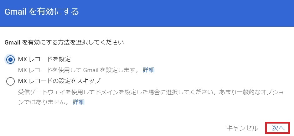 続いて、「MXレコードを設定」をクリックして「次へ」をクリックします。