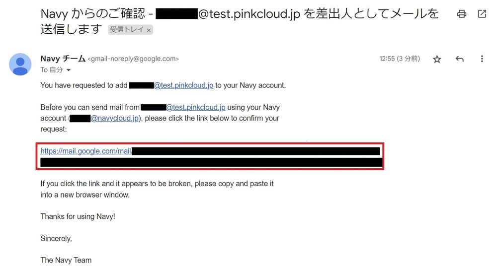 変更先のアドレスの Gmail にログインすると、以下の画面のように確認メールが送られてきています。