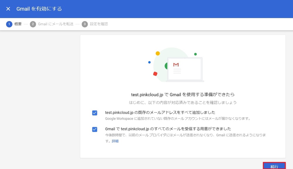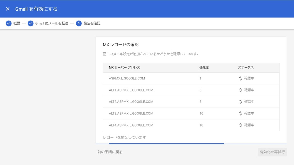 ドメインホストでのMXレコードの設定が終わりましたら、右下のアイコンをクリックして、追加した MX レコードを Google に認識させます。(下画面は認識させている最中の画面です。実際は「Gmail を有効にする」をクリックすると、以下のような画面になります。)