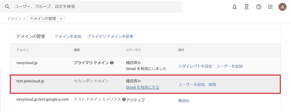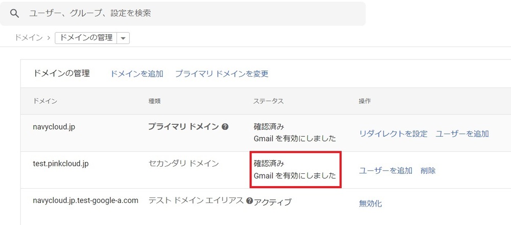 上記の設定により、登録したドメイン(今回でいうとセカンダリドメイン)からのメールの送受信が可能となります。以下の画面のようにセカンダリドメインとして設定させていることが確認できます。