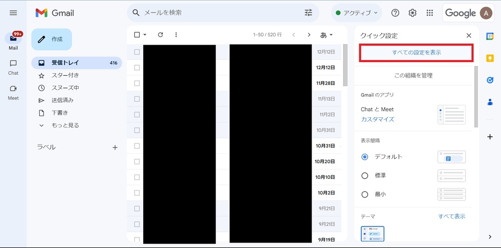 続いて、Gmail に移動します。画面の右上の歯車のようなアイコンをクリックして、「すべての設定を表示」をクリックします。