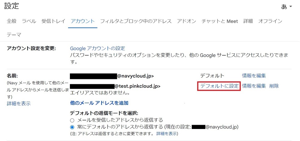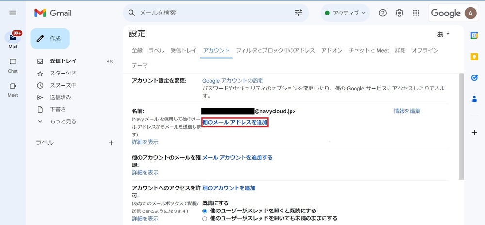 設定の画面に移動したら、「アカウント」のタブの中の「名前」:「他のメールアドレスを追加」をクリックします。