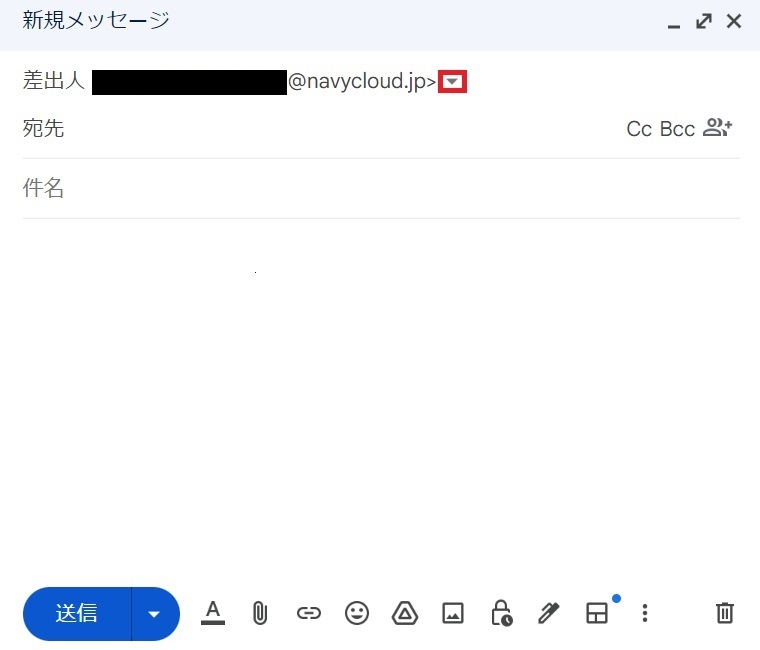 Gmail にてメールを新規作成してみます。そうすると以下の画面のように差出人の右端のところに下矢印が現れています。