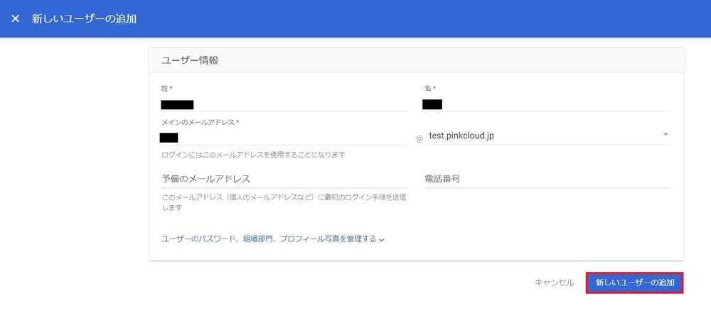 今回設定したセカンダリドメイン内のユーザーからメールを送信したいので、セカンダリドメイン内にユーザーを作成します。必要な事項を記入して、右下の「新しいユーザーの追加」をクリックすればドメイン内にユーザーが作成されます。