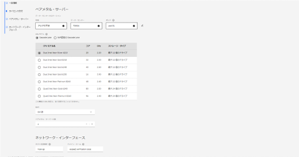 ・物理サーバのスペック(CPU種類、コア数、RAMサイズ)と台数を選択