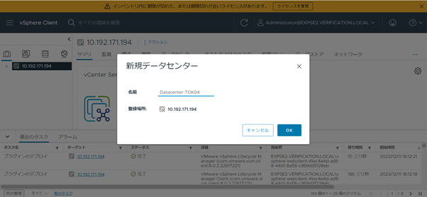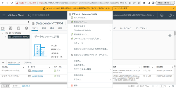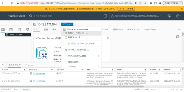 ・vSphere Clientの画面で、アクションをクリックし、新規データセンターを選択