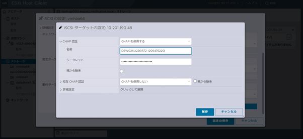 ユーザー名、パスワード、ホストIQNが設定されていることを確認して、メモに記録。この情報は後程ESXiデータストアの容量追加の工程にて必要。