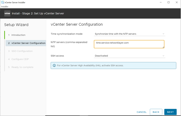 時刻同期モードとしてNTPサーバと同期することを選択し、続いてNTPサーバのFQDNを記入し、NEXTをクリック