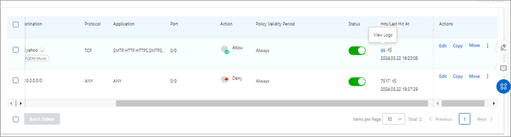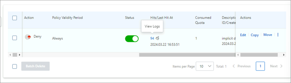 作成したimplicit denyポリシー行のHits/Last Hit At列の【View Logs】をクリックします。