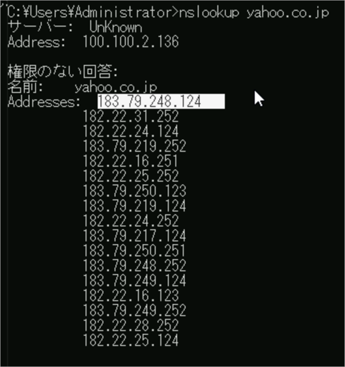 残念ながらドメイン名で宛先を検索することができないためクライアントでnslookupを行いyahoo.co.jpのIPアドレスを確認しました。