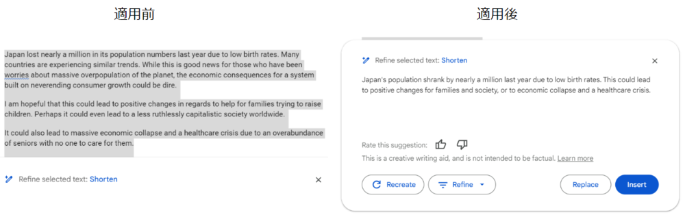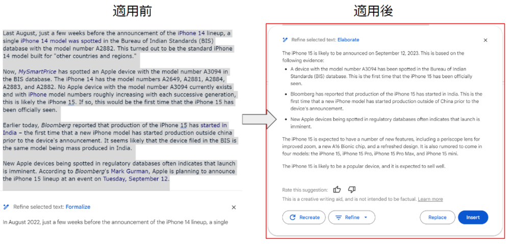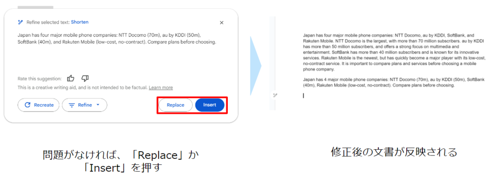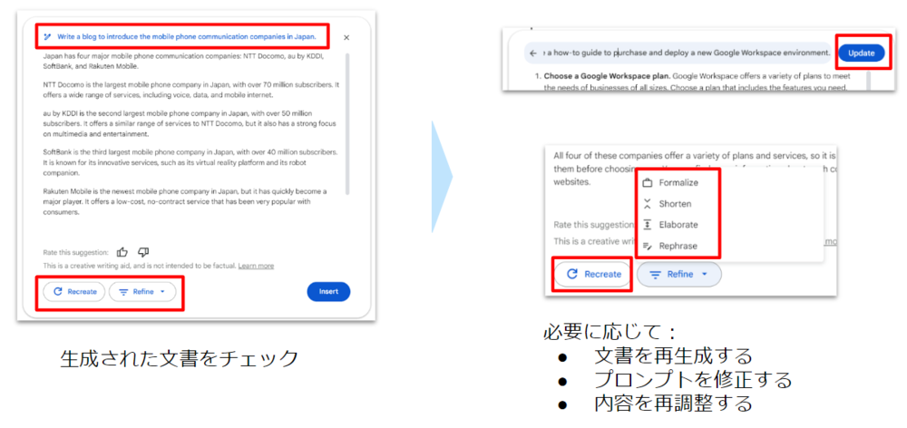 また、作業者が作成した文章に対して、「再生成(Recreate)」と「修正(Refine)」を実施することが可能になります。「修正(Refine)」には作成した文章に対して4つの機能が提供されています。