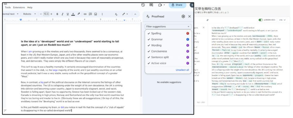 今回は [Help me write] の機能ではなく、生成された文書(下書き)をチェックする機能の仕様と性能を紹介します。また、「Google Docs」にAI校正ツール「Proofread」を含めて一緒に紹介したいと思います。