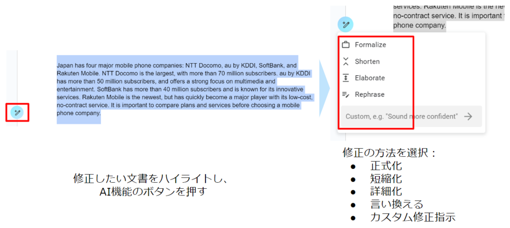 Shorten をすると元の文章を短縮し、場合により箇条書きでまとめてくれたり、簡潔なパラグラフで生成してくれたりすることがあります。