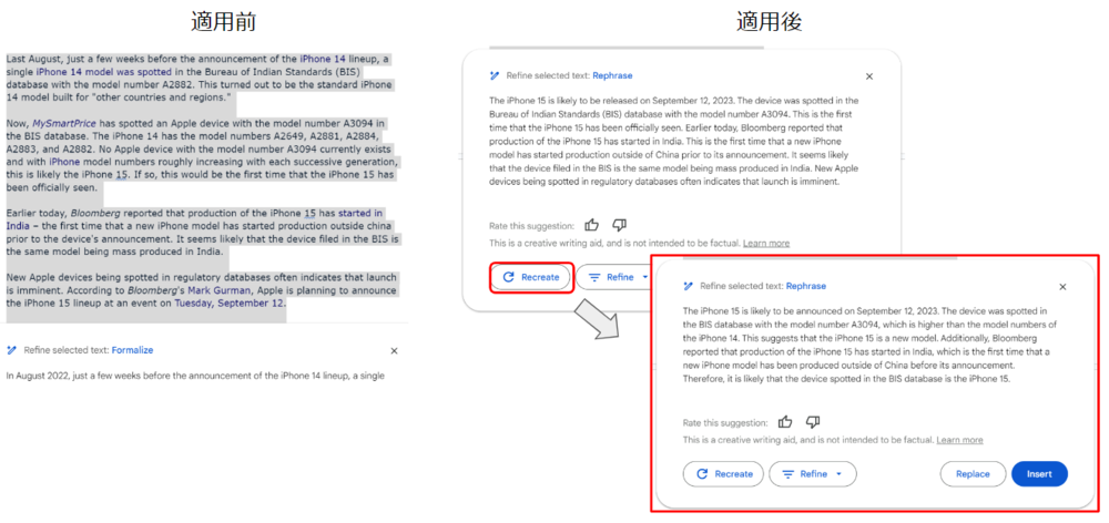 「Rephrase」は修正機能の中でも特徴的なものです。修正後の文章は、基本的に意味が変わることはありませんが、短縮されている印象を受けます。特定の詳細情報、例えばモデル名などが削除されることが確認できました。また、「recreate」を行う際の参照対象が、元の文章ではなく一度「rephrase」された文章であるように感じられ、結果として情報がさらに削除されたように思います。
