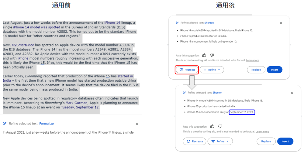 適用後の文章は、原文をほとんど包括していると感じられました。さらに「Recreate」をクリックすると、日付の英表現が変更され、年号「2023」が追加されました。