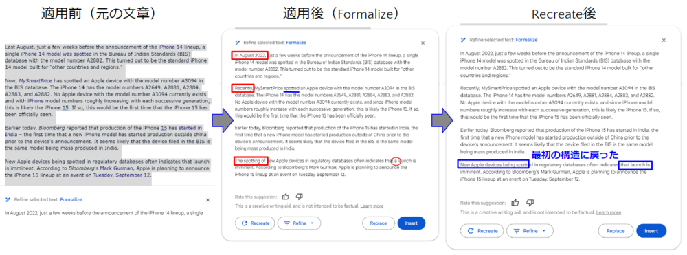 まず、新聞記事の一部を Formalize の校正機能で試し、いくつかの表現が正式な英表現に変わりました。追加検証として「Recreate」をクリックすると、修正後の文章の一部が元の表現にデグレードしてしまう事があります。