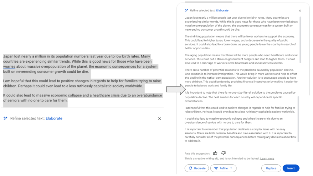 引き続き、同じ新聞記事と自由記事を活用し、「Elaborate(精細化)」機能を使用して新聞記事と自由記事を試すと、文章が箇条書きで修正されることが確認されました。内容は元の記事よりも分かりやすく、論理的な関係も整理されています。