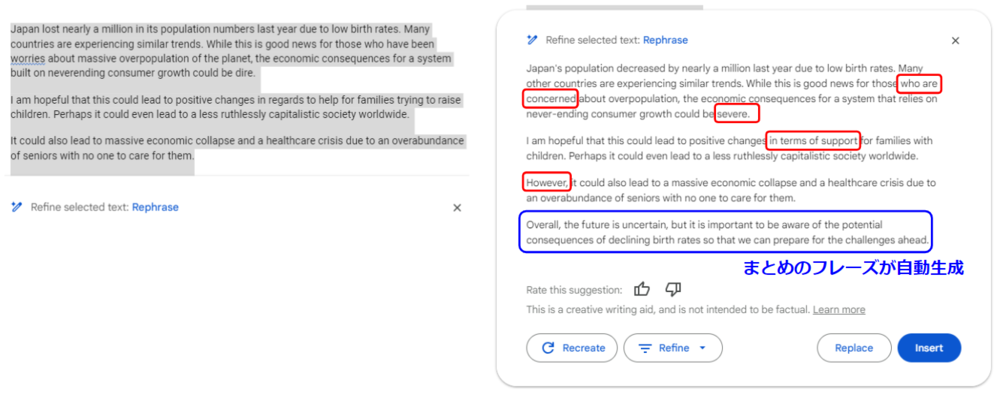 日常の記事を「rephrase」してみたところ、文言には一部修正が加えられましたが、文字数が減少するわけではありませんでした。最後に、要約のフレーズが自動生成される点については、場面や内容に応じて不要であったり、意図と異なる内容が生成されるリスクも考慮する必要があります。