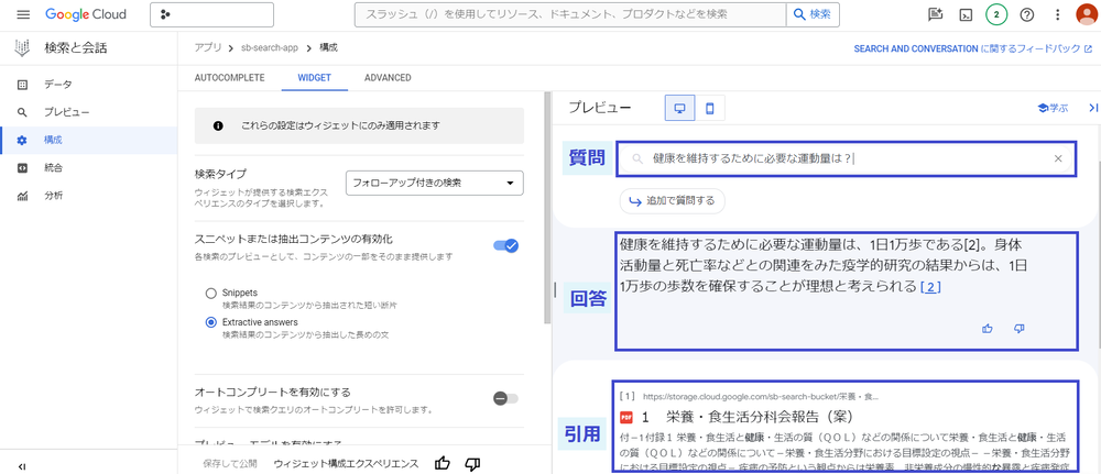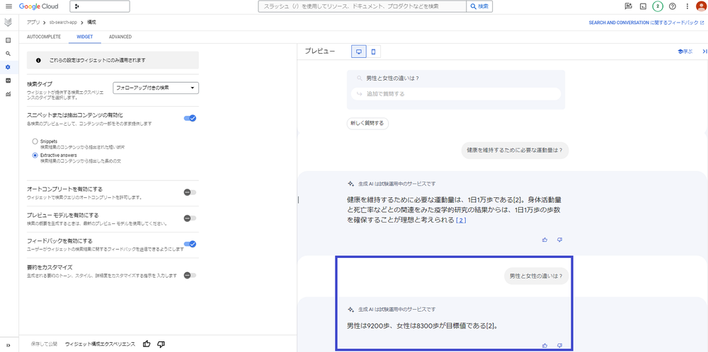 詳しくは、こちらのブログ「Vertex AI Search (旧称 Gen App Builder の Enterprise Search) の日本語版を試してみた」をご覧ください。