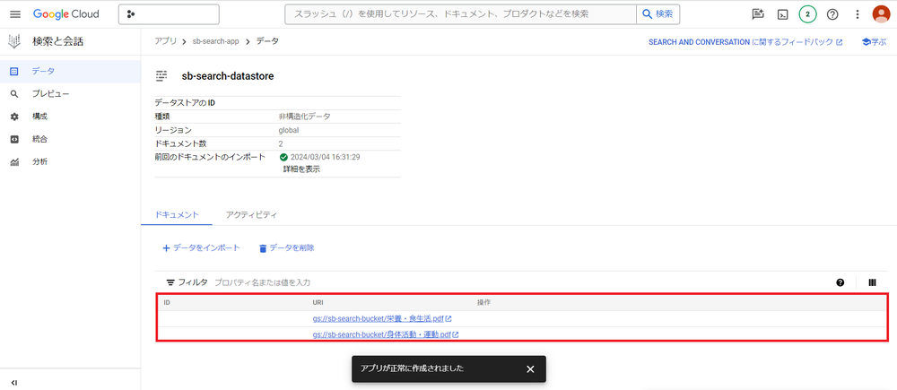 インポートが完了し、ドキュメントタブに Cloud Storage にアップロードしたデータが表示されれば、アプリの作成は完了です。