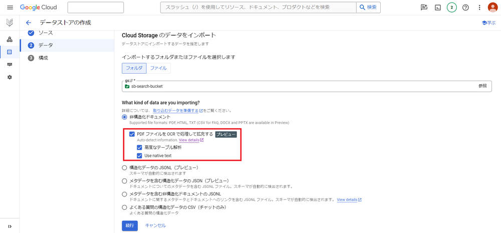 インポートするデータの種類は「非構造ドキュメント」を選択します。