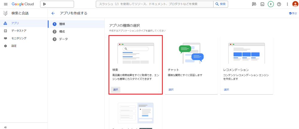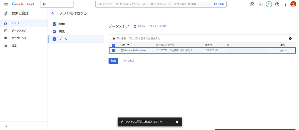 作成したデータストアを選択し、アプリを作成します。
