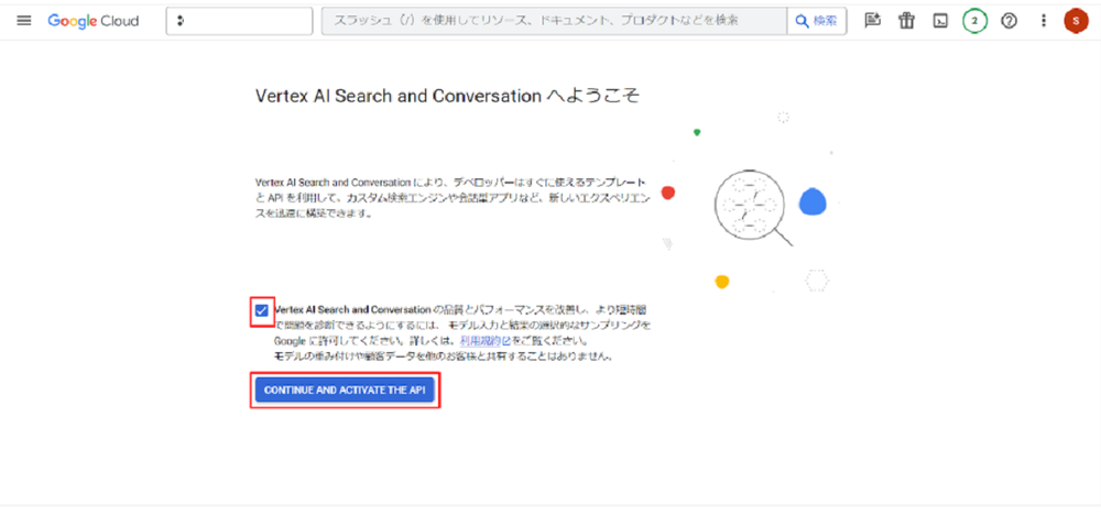 [検索と会話] にアクセスします。初めて利用する方は、規約にチェックしAPIを有効化してください。