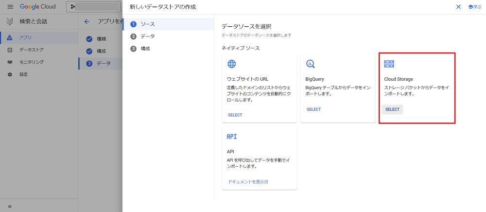 新しいデータストアの作成時に、「Cloud Storage」を選択し、対象のバケットまたはファイルを選択します。