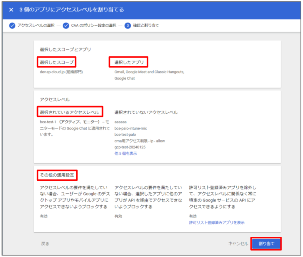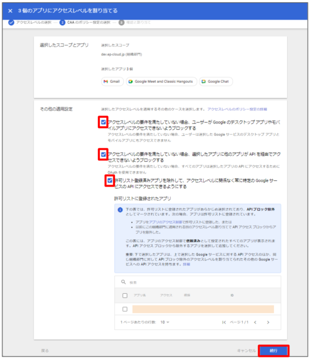 ステップ3において、「選択したスコープ」、「選択したアプリ」、「選択されているアクセスレベル」、「その他の適用設定」を確認することができます。