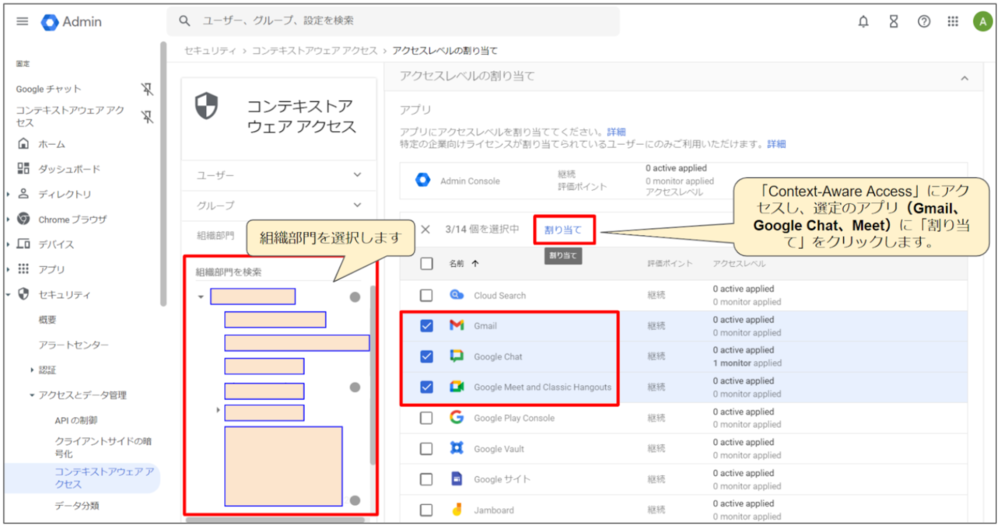 複数のアプリに同じアクセスレベルを一度に割り当てるには、各アプリの横にあるチェックボックスをオンにして、上部の「割り当て」をクリックします。ここでは、Gmail、Google Chat、Google Meet and Classic Hangouts を例に選びました。