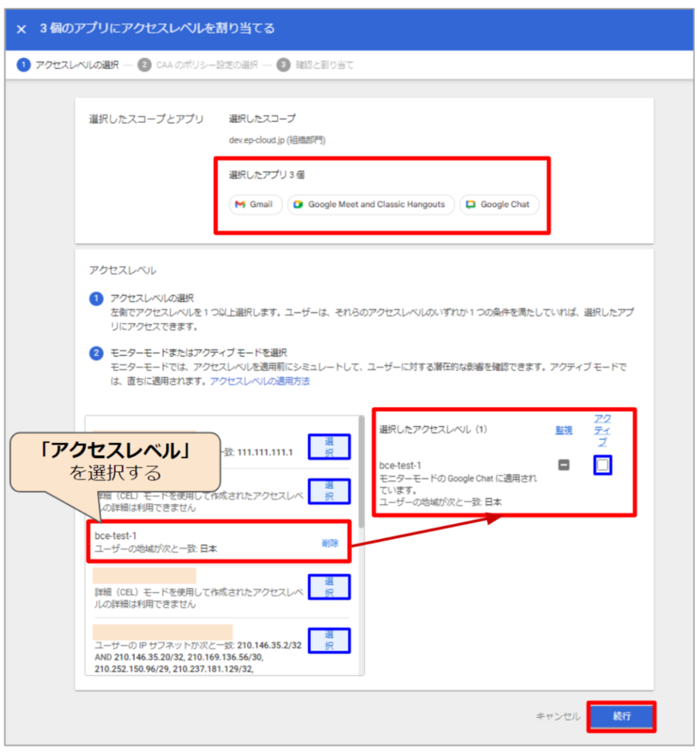 設定予定のアクセスレベル(bce-test-1)の右側の「選択」ボタン(青い枠)をクリックし、 1 つ以上(最大 10 個)クリックして選択します。選択したアクセスレベルが右側に表示され、デフォルトで [モニター] モードに設定されます。