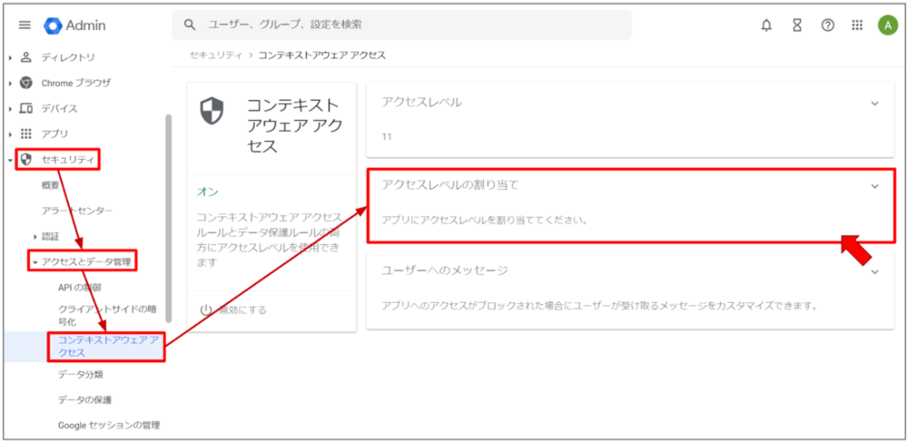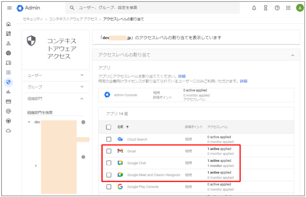 ・「アクセスレベルを満たしていない場合、ユーザーによる Google のデスクトップ アプリとモバイルアプリへのアクセスをブロックする」 をオンにします。そうすると、ネイティブのパソコン、Android アプリ、iOS アプリ、ウェブアプリのユーザーにアクセスレベルを適用します。