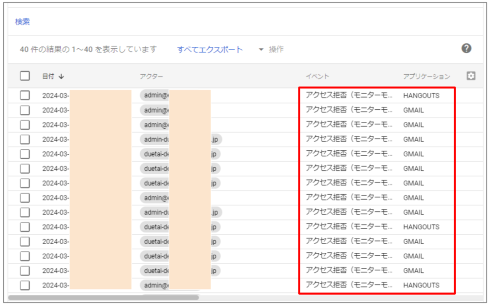 Context-Aware Accessポリシーを設定後、その実行結果がログで確認可能です。したがって、Gmail や Hangouts へのアクセスが拒否された時のログが記録されます。このログを確認することで、管理者はポリシーの影響を事前に理解できます。