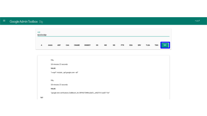example.jp. 3600 IN TXT "google-site-verification=I90C_bFl1ASXToys3ifsQNv9fb0jMPo3smPuJJ1guxo"