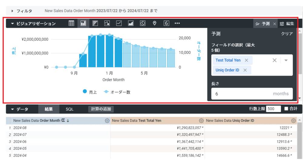 ビジュアリゼーションにて予測したいフィールドと期間を選択すると自動で予測をしてくれます。