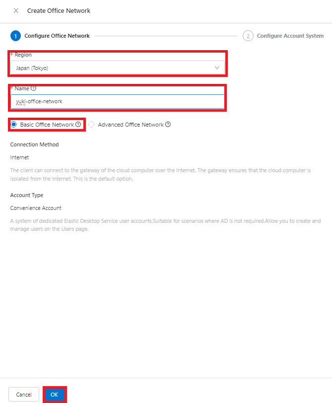 ③Regionを「Japan/Tokyo」、Nameには任意の名前を入力、Basic Office Networkを選択し、「OK」をクリックします。