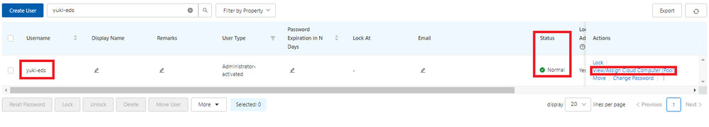 ⑩ユーザーが作成されたことを確認し、Statusが「Normal」であることを確認します。その後、作成したユーザーのActionsで「View/Assign Cloud Computer(Pool)」をクリックします。