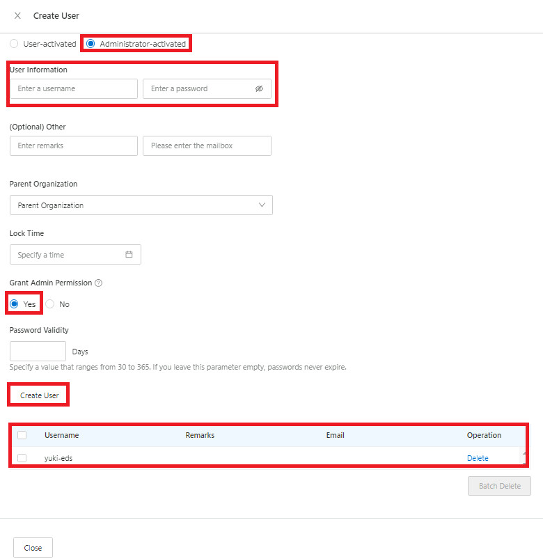 ⑨Administrator-activatedを選択、User Informationにユーザー名とパスワードを入力、Grant Admini Permissionはyesを設定した後、「Create User」をクリックし、画面最下部に作成したユーザーが表示されることを確認します。作成したユーザーが表示されたら「Close」をクリックします。