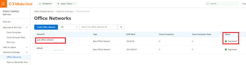 ④ Office Networkが表示されることを確認し、Statusが「Registered」になっていることを確認します。