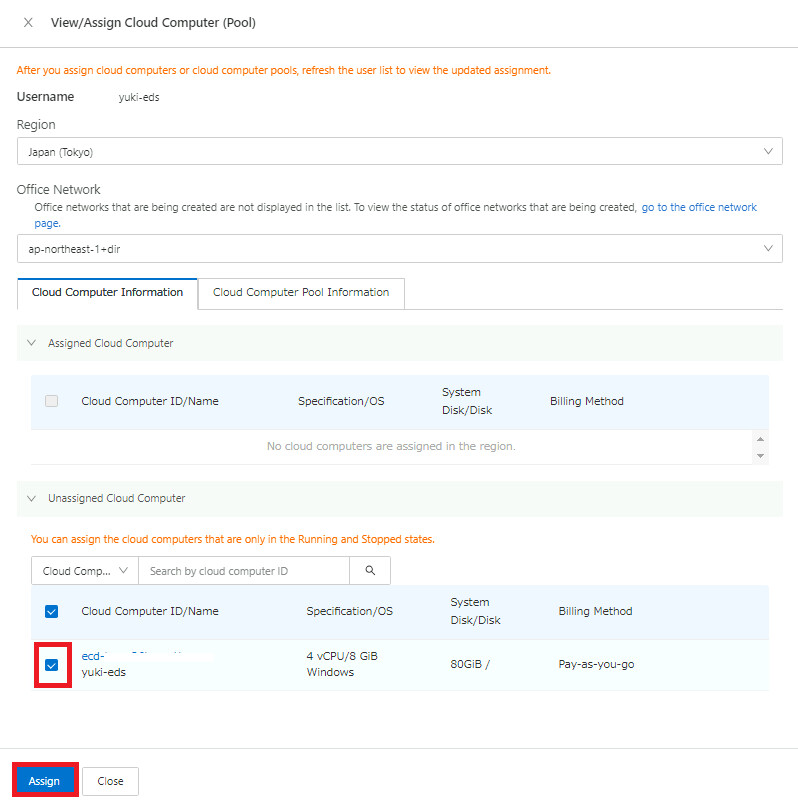 ⑪表示された画面で⑦に作成したインスタンスのチェックボックスにチェックを入れ、「Assign」をクリックします。