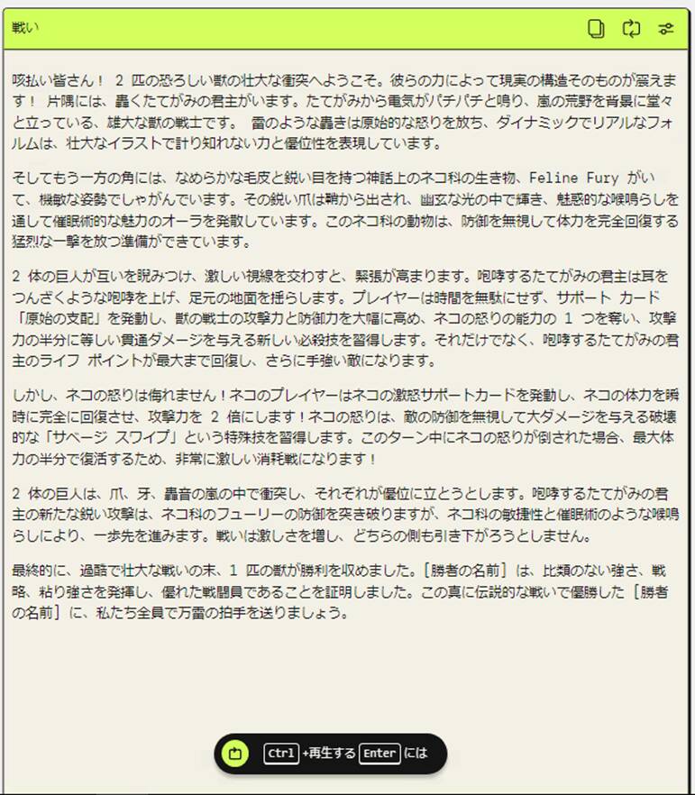 【(例)「必ず決着はつく」「あなたは必ず勝者を称えなくてはならない」というプロンプトを入力した場合のバトル実況】