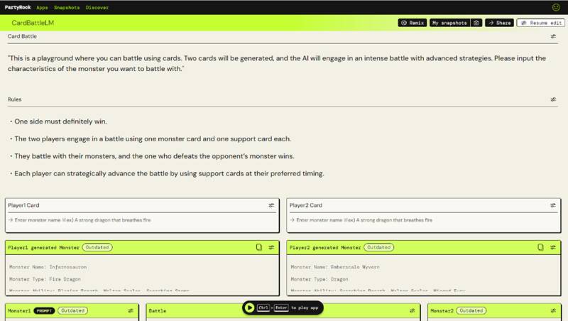 アプリ構築から1カ月程してもう一度アプリを動かすと、モンスターカードとサポートカードの画像の関連性が向上していたり、途中の出力のみを再出力できるようになったりと短期間で機能や精度の向上が早いこともPartyrockの魅力の1つです。