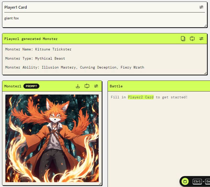 最後にバトルフェーズでは、2人のプレイヤーがモンスターカードとサポートカードを駆使してバトルをするのですが、勝敗がつかずに終了してしまうケースが多発しました。そこで、プロンプトに「必ず決着はつく」という文言を追加しましたが、それでも決着がつかないケースがは解決されませんでした。そこで、実況者が実況しているという前提条件から着想し、「必ず決着はつく」の他に「あなたは必ず勝者を称えなくてはならない」と更なる決着に関わる文言をプロンプトに追加しました。その結果、毎回バトルの決着がつくようになりました。